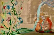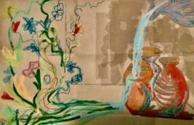 I created Vases and Vines to illustrate how I want to use the gifts that God gave me (represented as a stream of water pouring from the Pitcher) into a simple and imperfect clay vessel (me) to create blessings and joy in the lives of others (the vibrantly colored, spreading and blooming vines.